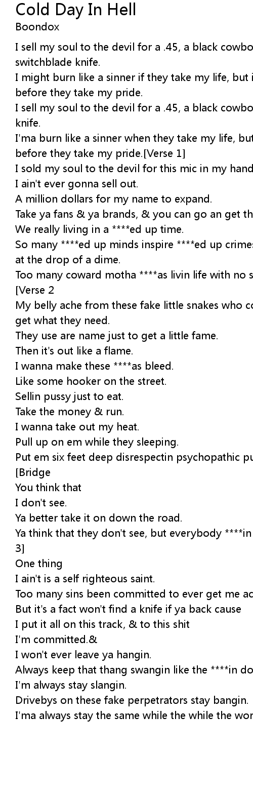 [Chorus]I sell my soul to the devil for a .45, a black cowboy hat, & a switchblade knife. |