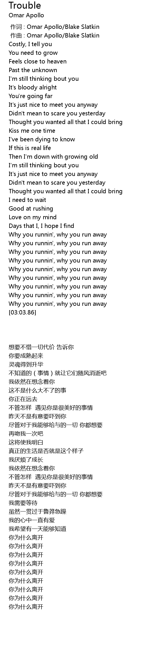 | [03:00.11] | Why you runnin', why you run away |