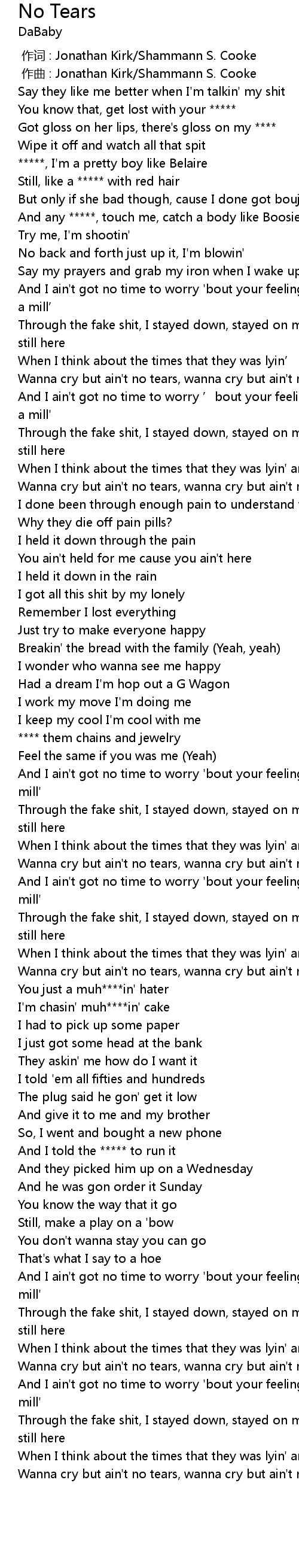 | [00:33.032] | Wanna cry but ain't no tears, wanna cry but ain't no tears |