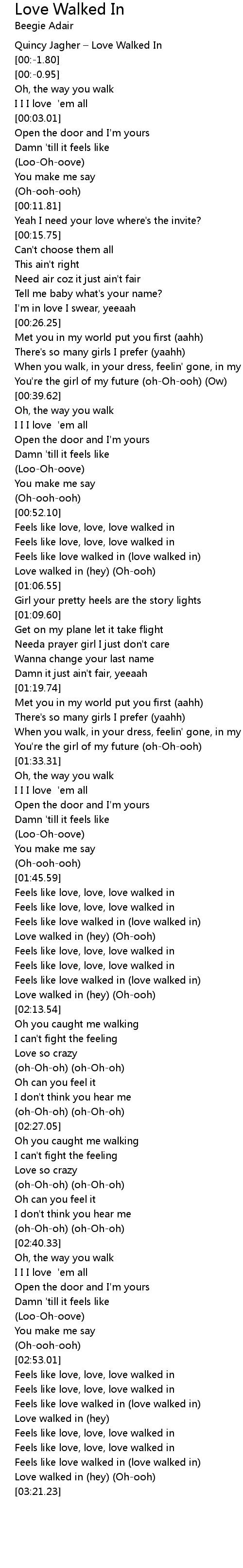 | [02:03.16] | Feels like love, love, love walked in |