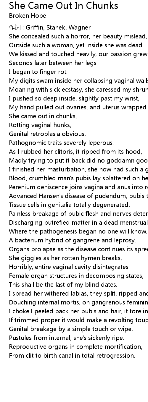 | I choke. I peeled back her pubis and hair, it tore in such a way, | |