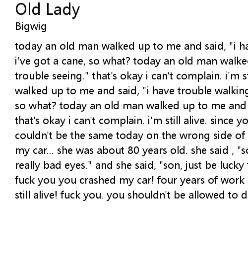 today an old man walked up to me and said, "i have trouble walking." that's okay i've got a cane, so what? today an old man walked up to me and said, "i have trouble seeing." that's okay i can't complain. i'm still alive. today an old man walked up to me and said, "i have trouble walking." that's okay i've got a cane, so what? today an old man walked up to me and said, "i have trouble seeing." that's okay i can't complain. i'm still alive. since you crashed my car it just couldn't be the same today on the wrong side of the road an old lady she crashed my car... she was about 80 years old. she said , "son i'm sorry but i have really bad eyes." and she said, "son, just be lucky that you're still alive." fuck you you crashed my car! four years of work in a junk yard. be lucky you're still alive! fuck you. you shouldn't be allowed to drive! |