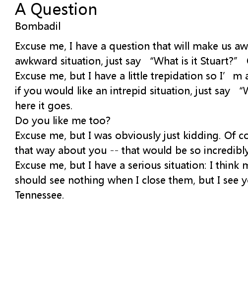 | Excuse me, I have a question that will make us awkward. So, if you would like an awkward situation, just say " What is it Stuart?" Okay, here it goes. | |