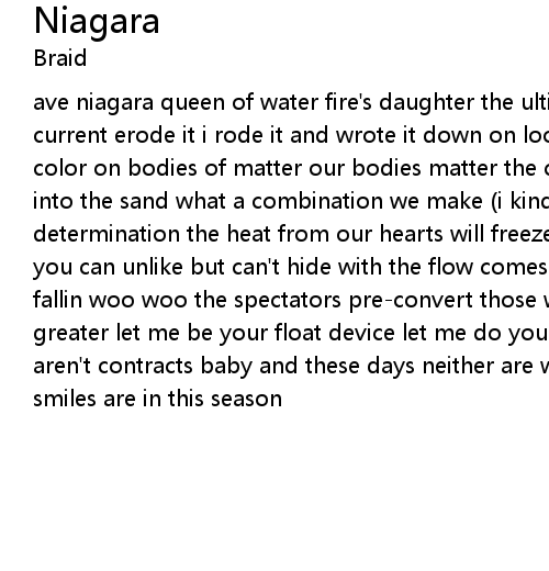 ave niagara queen of water fire's daughter the ultimate author follow the current erode it i rode it and wrote it down on looseleaf paper oh river oh lay color on bodies of matter our bodies matter the colors scatter down our legs into the sand what a combination we make (i kind of like you a lock) with some determination the heat from our hearts will freeze out the lake you have eyes you can unlike but can't hide with the flow comes rise... ave niagara keep on fallin woo woo the spectators pre-convert those water haters look for something greater let me be your float device let me do your swear work cause kisses aren't contracts baby and these days neither are words niagara sugar even odd smiles are in this season