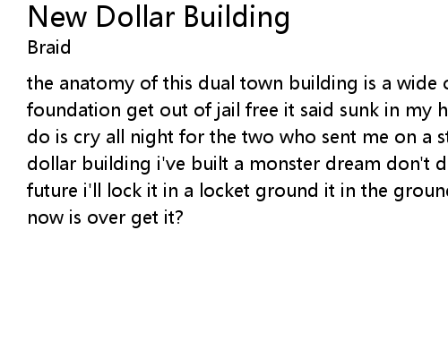 | the anatomy of this dual town building is a wide open structure with no foundation get out of jail free it said sunk in my head but all i've learned to do is cry all night for the two who sent me on a stupid quest for a new rag dollar building i've built a monster dream don't die on me please when i find my future i'll lock it in a locket ground it in the ground pocket in a pocket until now is over get it? |