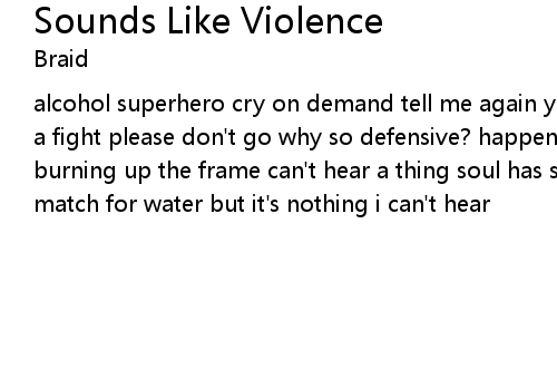 | alcohol superhero cry on demand tell me again you sound like violence and i feel a fight please don't go why so defensive? happens so wakes the senses intenses burning up the frame can't hear a thing soul has skipped sounds like rain's no match for water but it's nothing i can't hear |