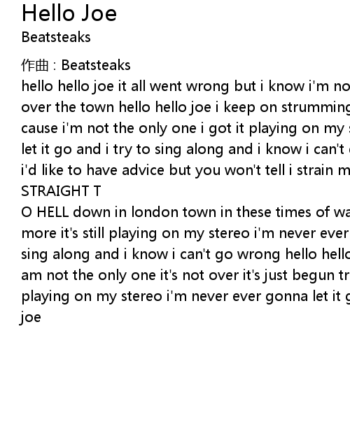 | hello hello joe it all went wrong but i know i'm not alone play this tune all over the town hello hello joe i keep on strumming and i know i'll get it done cause i'm not the only one i got it playing on my stereo i'm never ever gonna let it go and i try to sing along and i know i can't go wrong hello hello joe i'd like to have advice but you won't tell i strain my ears to | |