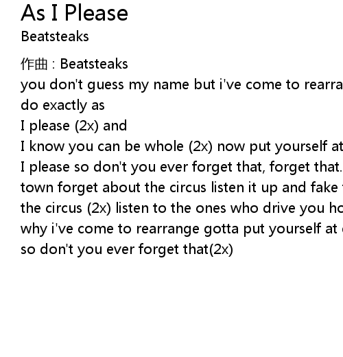 | I please so don' t you ever forget that, forget that... listen it up and take the town forget about the circus listen it up and fake the crown and bounce around the circus 2x listen to the ones who drive you home 3x now you guess my name why i' ve come to rearrange gotta put yourself at ease i do exactly as i please so don' t you ever forget that 2x |