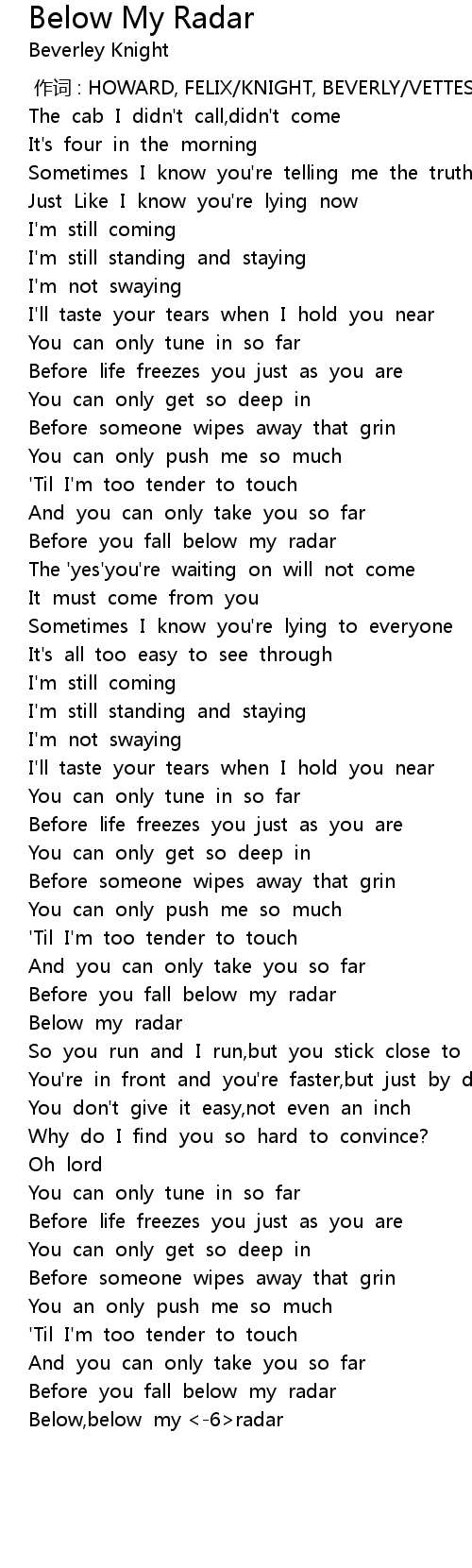| [00:00.00] | 作词 : HOWARD, FELIX/KNIGHT, BEVERLY/VETTESE, PETER JOHN |