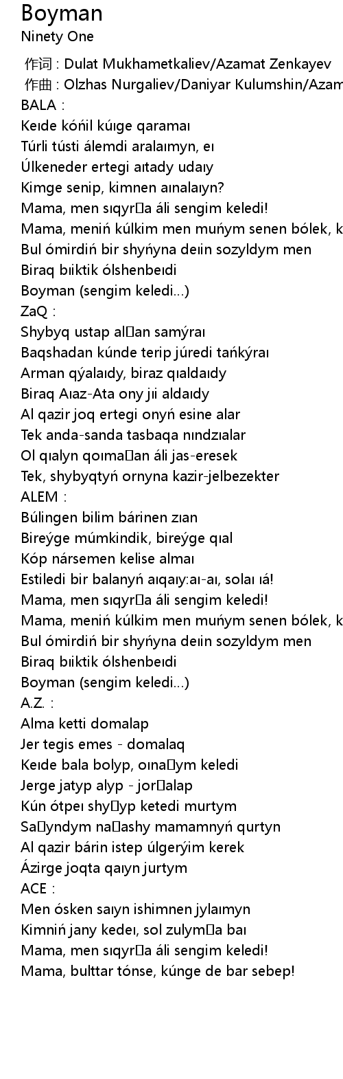 | [00:01.000] | zuo qu : Olzhas Nurgaliev Daniyar Kulumshin Azamat Ashmakyn |