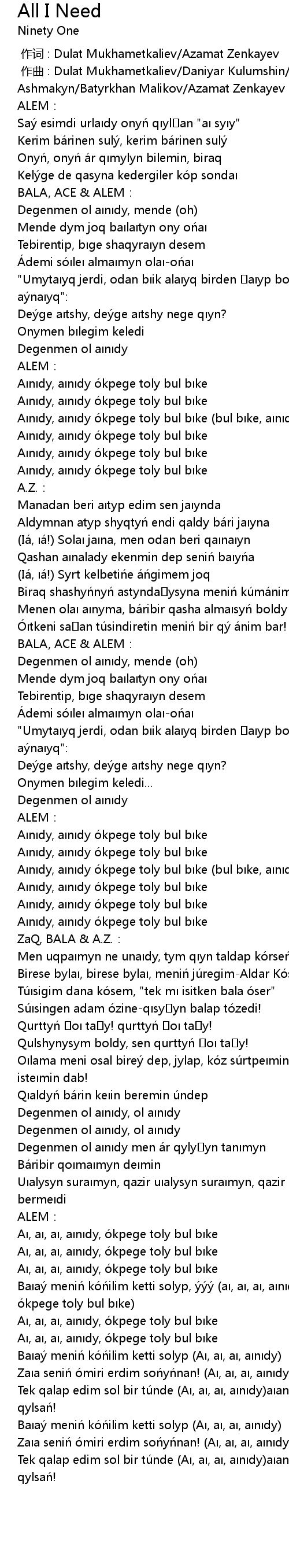 | [04:03.81] | Aı, aı, aı, aınıdy, ókpege toly bul bıke |