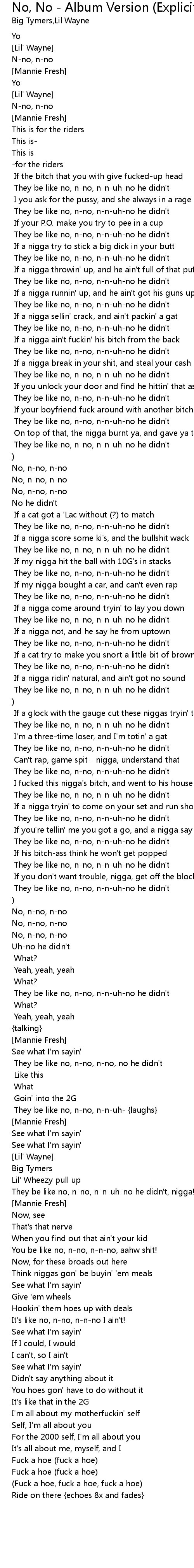 [Lil' Wayne] They be like no, n-no, n-n-uh-no he didn't |