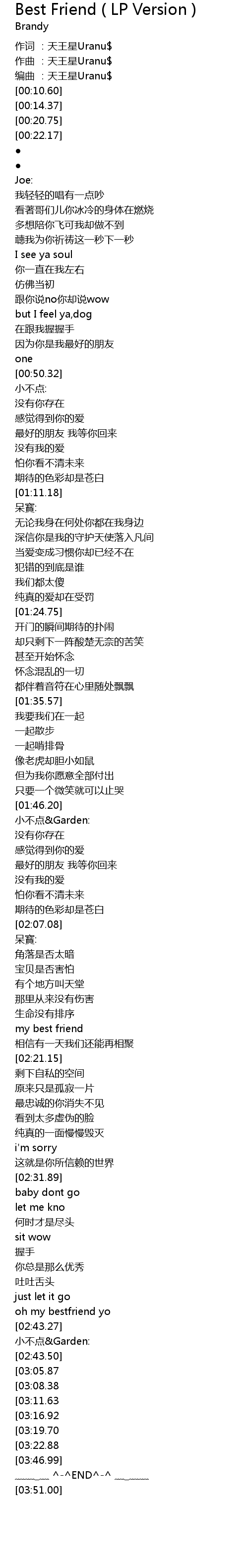 | [03:33.77][03:11.63][02:48.65] | 最好的朋友 我等你回来 |