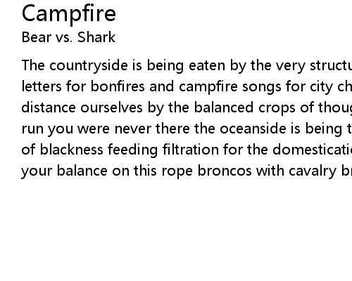 | The countryside is being eaten by the very structure that we lean on love letters for bonfires and campfire songs for city children nowhere to run distance ourselves by the balanced crops of thought till the field no where to run you were never there the oceanside is being torn down by the countless drops of blackness feeding filtration for the domestication of diseases you'll lose your balance on this rope broncos with cavalry bringing me home |