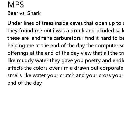 Under lines of trees inside caves that open up to cityscapes i was a failure and they found me out i was a drunk and blinded sailor to sew your insides close these are landmine carburetors i find it hard to believe that the medicine is helping me at the end of the day the computer screens give blue and silent offerings at the end of the day view that all the trains are churches and roads like muddy water they gave you poetry and endless hours of conversation and it affects the colors over i'm a drawn out corporate warrior on the night that smells like water your crutch and your cross your voltage your watts and at the end of the day |