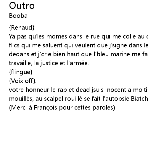 | votre honneur le rap et dead jsuis inocent a moitie simpson. Les strings sont mouille s, au scalpel rouille se fait l' autopsie. Biatch. | |