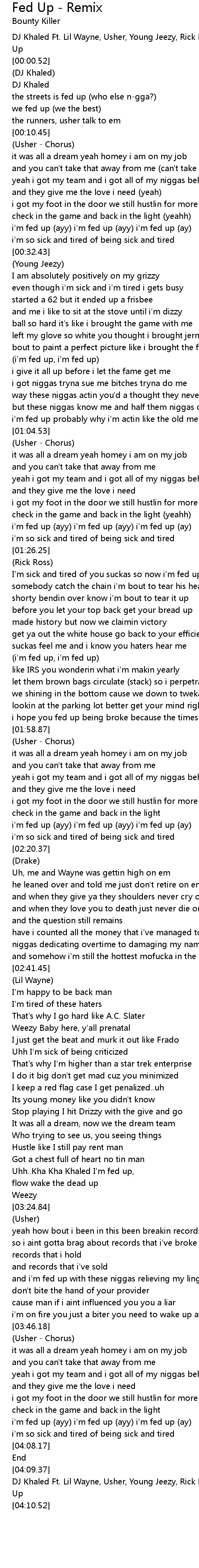 | [04:10.02] | DJ Khaled Ft. Lil Wayne, Usher, Young Jeezy, Rick Ross & Drake - Fed Up |