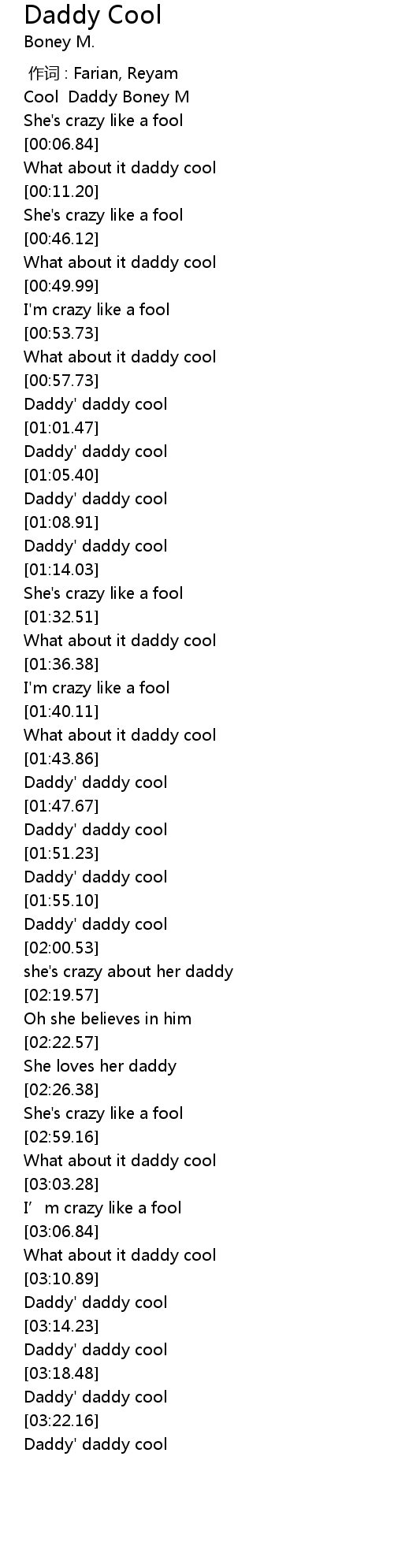 | [03:00.78] | What about it daddy cool |