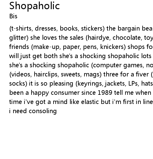 (t-shirts, dresses, books, stickers) the bargain beauty (seven inches, shoes, glitter) she loves the sales (hairdye, chocolate, toys, pictures) shops for her friends (make-up, paper, pens, knickers) shops for herself when in doubt she will just get both she's a shocking shopaholic lots of bags, happy all the time she's a shocking shopaholic (computer games, notebooks, bags) draws out a plan (videos, hairclips, sweets, mags) three for a fiver (guitars, jumpers, CDs, socks) it is so pleasing (keyrings, jackets, LPs, hats) tension releasing i've been a happy consumer since 1989 tell me when the sales start yes i'm always on time i've got a mind like elastic but i'm first in line you know i have to buy, i need consoling