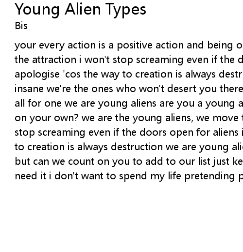 your every action is a positive action and being on the outside is just part of the attraction i won't stop screaming even if the doors open for aliens i won't apologise 'cos the way to creation is always destruction we're the ones who feel insane we're the ones who won't desert you there's nothing sacred in our name all for one we are young aliens are you a young alien, do you feel like you're on your own? we are the young aliens, we move through computer and phone i won't stop screaming even if the doors open for aliens i won't apologise 'cos the way to creation is always destruction we are young aliens they think we don't exist but can we count on you to add to our list just keep the secret you're gonna need it i don't want to spend my life pretending pretending i'm you |