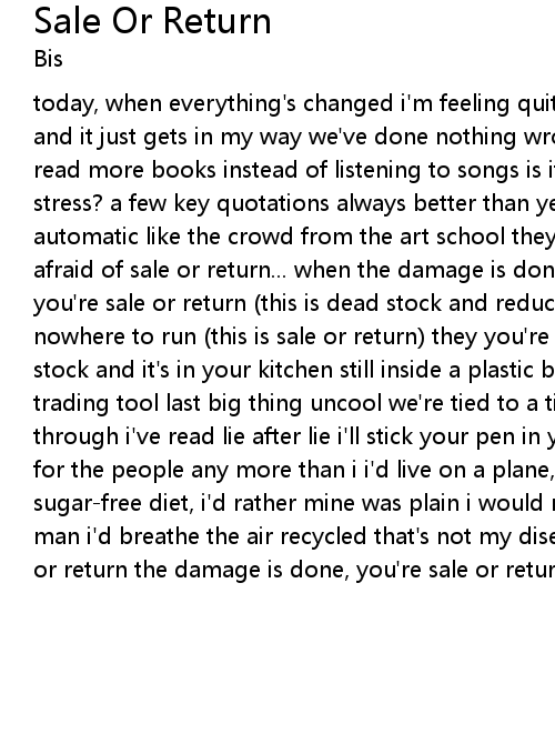 today, when everything's changed i'm feeling quite strange it's not in my head and it just gets in my way we've done nothing wrong it's taken so long should've read more books instead of listening to songs is it meaningless, and excuse for stress? a few key quotations always better than yes i'd be enigmatic never talk automatic like the crowd from the art school they're so important we're all afraid of sale or return... when the damage is done this is sale or return then you're sale or return (this is dead stock and reduced to clear) when there's nowhere to run (this is sale or return) they you're sale or return (this is dead stock and it's in your kitchen still inside a plastic bag) been used as a trading tool last big thing uncool we're tied to a timebomb everyone can see through i've read lie after lie i'll stick your pen in your eye you don't speak for the people any more than i i'd live on a plane, nothing to explain no sugar-free diet, i'd rather mine was plain i would never land and be devalued by man i'd breathe the air recycled that's not my disease we're all afraid of sale or return the damage is done, you're sale or return |