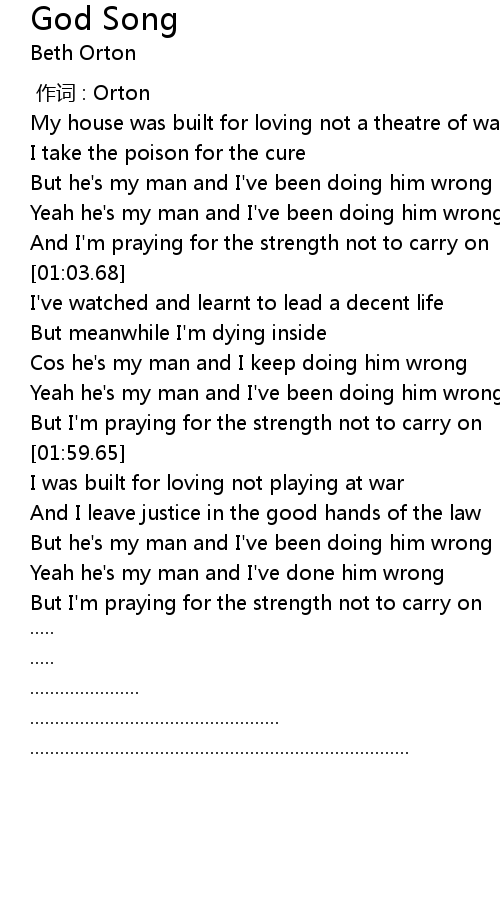 | [00:57.39] | And I'm praying for the strength not to carry on |