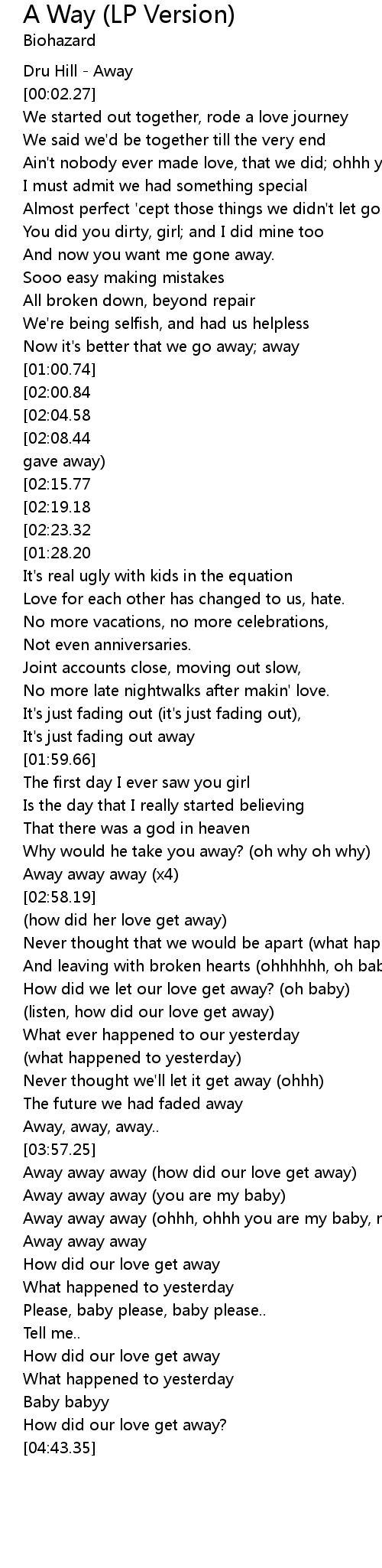 | [03:58.32] | Away away away (how did our love get away) |