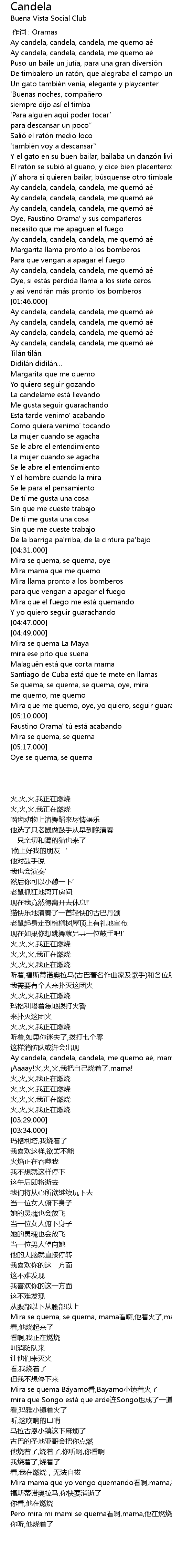 | [01:46.000] | Ay candela, candela, candela, me quemo aé, mama ¡Aaaay!火,火,火,我把自己烧着了,mama! |