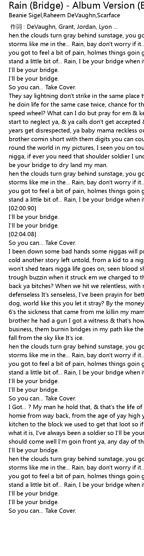 | [03:42.13] | I Got... ? My man he hold that, that' s the life of my blood you my homie from way back, from the age of yay high you was in grace to show? from the kitchen to the block we used to get that loot so if you need to call me you know what it is, I' ve always been a soldier so I' ll be your bridge, If the drought should come well I' m goin front ya, any day of the winter any thirsty summer, I' ll be your bridge. |