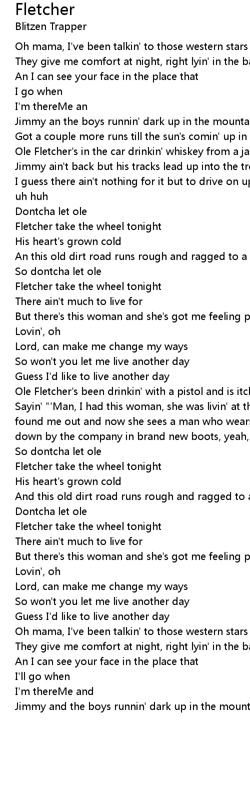 Ole Fletcher's in the car drinkin' whiskey from a jar through his teeth |