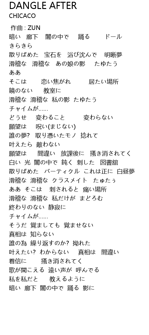 | [00:16.700] | 暗い 廊下 闇の中で 踊る ドール きらきら |