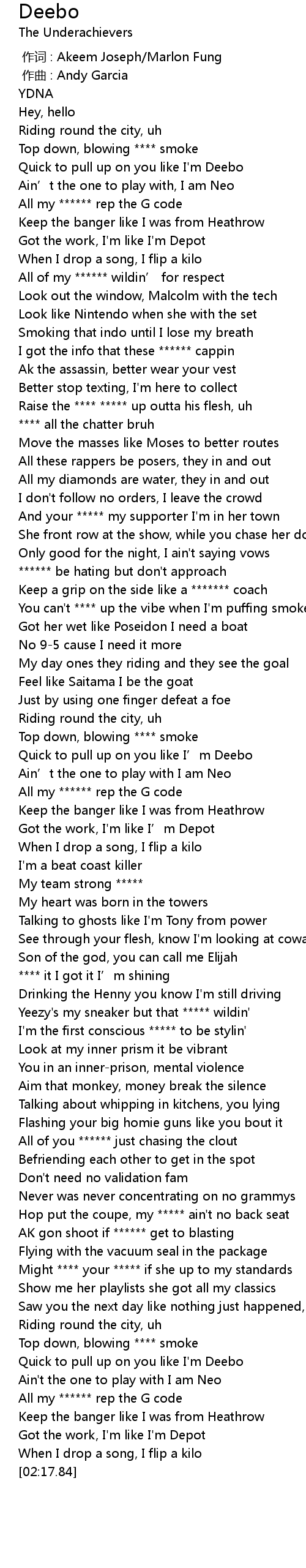 | [00:17.22] | Quick to pull up on you like I' m Deebo |