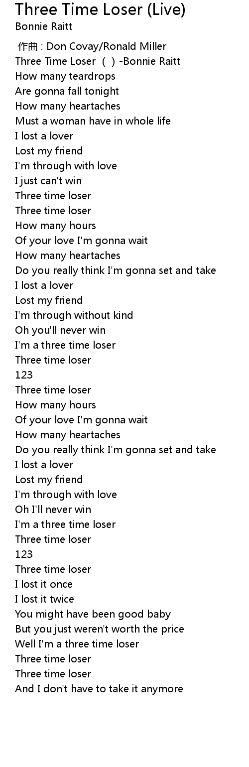 | [00:00.00] | Three Time Loser ()-Bonnie Raitt |