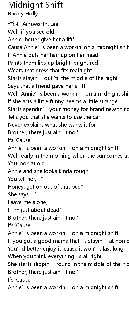 | Annie' s been a workin' on a midnight shift | |