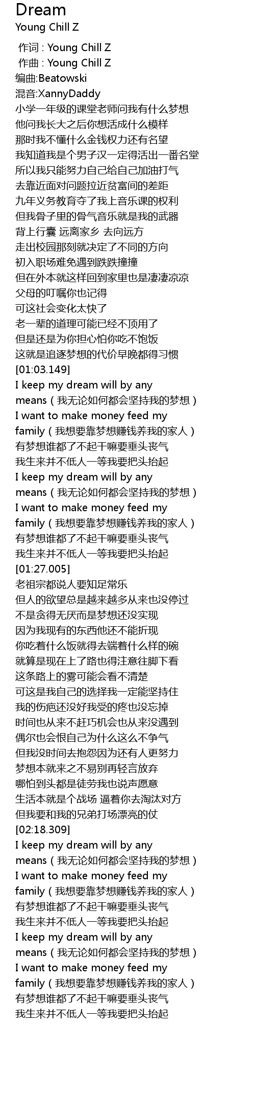 | [02:22.549] | I want to make money feed my family(我想要靠梦想赚钱养我的家人) |