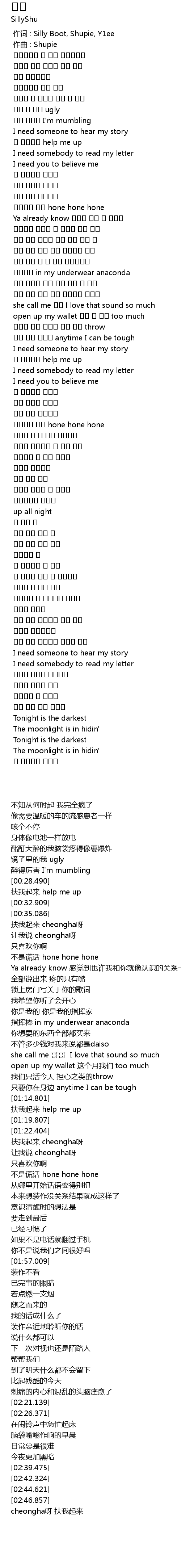| [00:00.000] | 作词 : Silly Boot, Shupie, Y1ee |