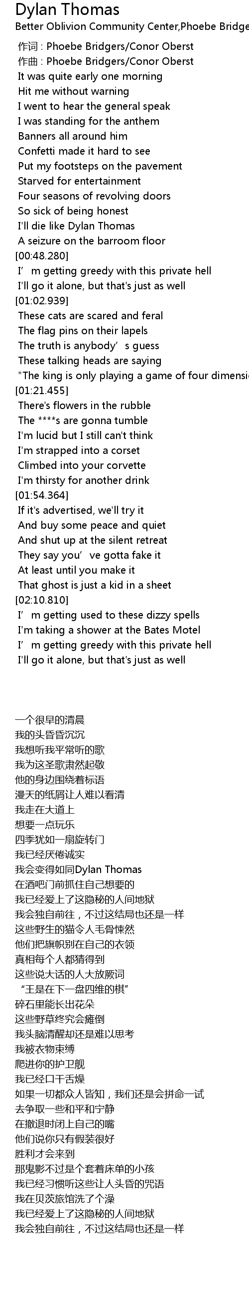 | [00:42.909] | 我会变得如同Dylan Thomas |