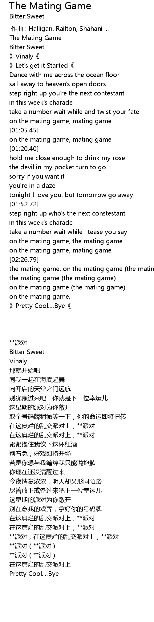| [02:33.84] | the mating game, on the mating game the mating game |