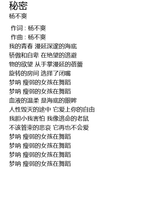 | [00:00.000] | 作词 : 杨不爽 |