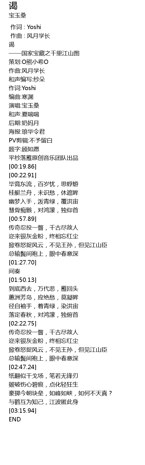 | [00:03.91] | guó jiā bǎo zàng zhī qiān lǐ jiāng shān tú |