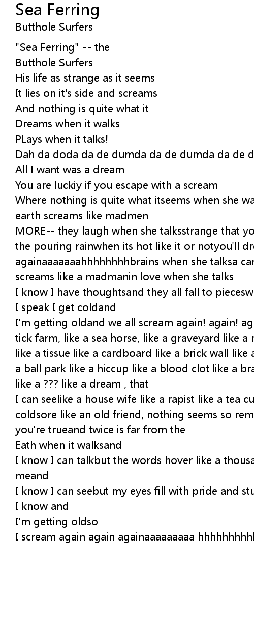 I'm getting oldand we all scream again! again! again!aaaaaaaaahhhhhhhhhhhlike a tick farm, like a sea horse, like a graveyard like a moron, likea girlfriend like a tissue like a cardboard like a brick wall like a dream,waiting to belike a ball park like a hiccup like a blood clot like a brain stroke likea long drip like a ??? like a dream , that |