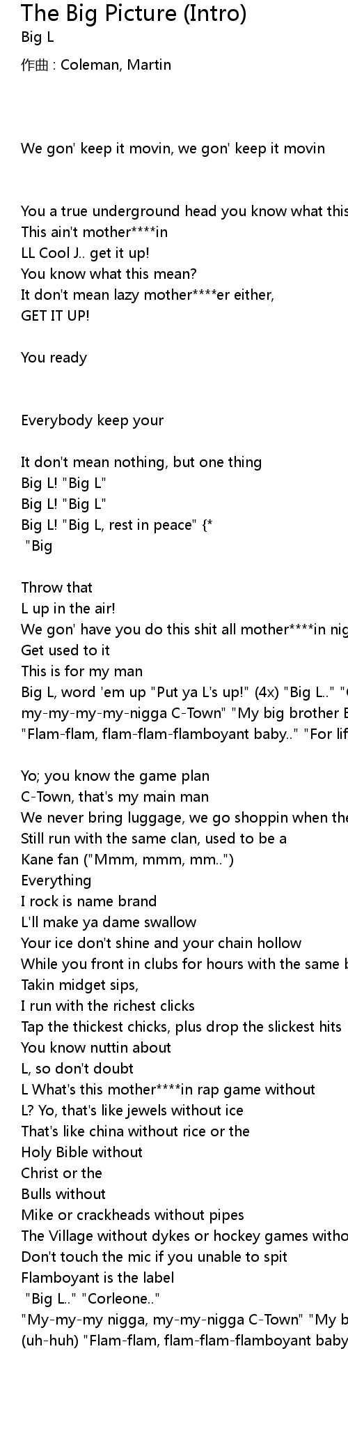 | Big L, word ' em up " Put ya L' s up!" 4x " Big L.." " Corleone.." " Mymymy nigga, mymymymynigga CTown" " My big brother Big Lee, holdin it down" uhhuh " Flamflam, flamflamflamboyant baby.." " For life!" " Big L.." " For my man Big L" .. " BIG L!!" Big L | |