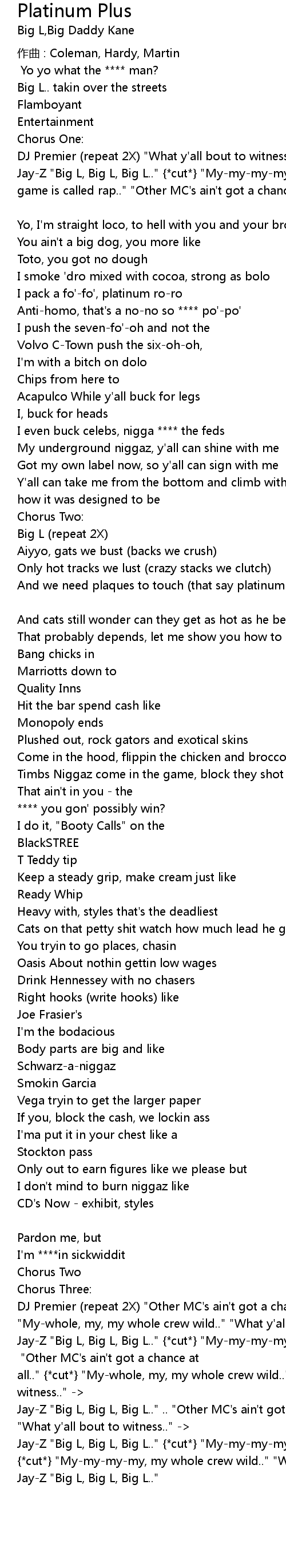 | JayZ " Big L, Big L, Big L.." cut " Mymymymy, my whole crew wild.." " The game is called rap.." Premier keeps cutting " Other MC' s ain' t got a chance at all.." cut " Mywhole, my, my whole crew wild.." " What y' all bout to witness.." | |