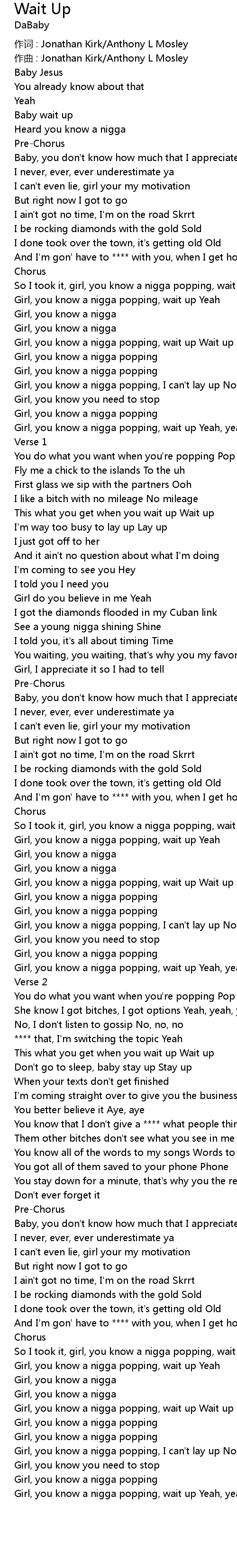 | Girl, you know a nigga popping, wait up Wait up | |
