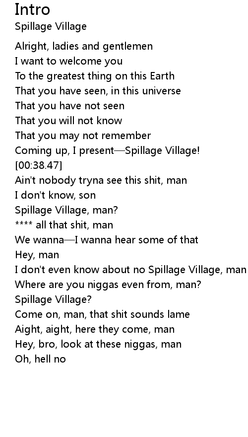 | [00:38.91] | I don' t even know about no Spillage Village, man |