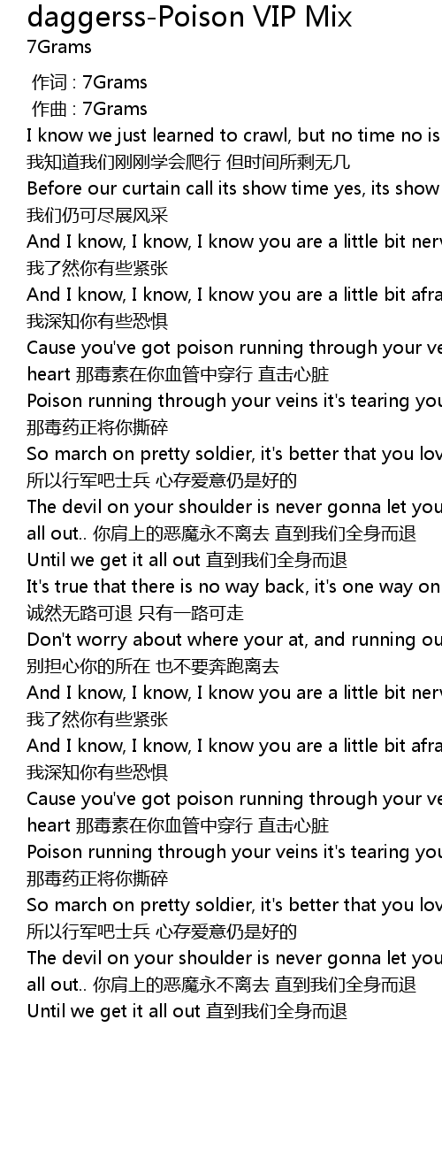 | [00:58.48] | Cause you' ve got poison running through your veins straight to your heart nà dú sù zài nǐ xuè guǎn zhōng chuān xíng zhí jī xīn zàng |