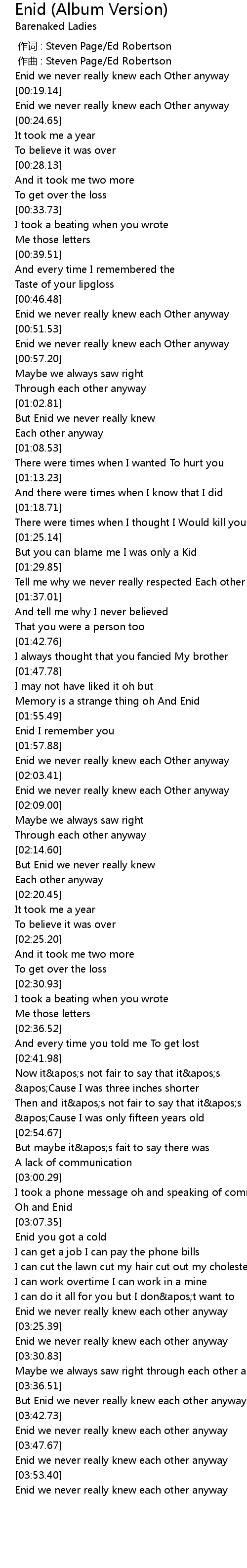 | [00:52.82] | Enid we never really knew each Other anyway |