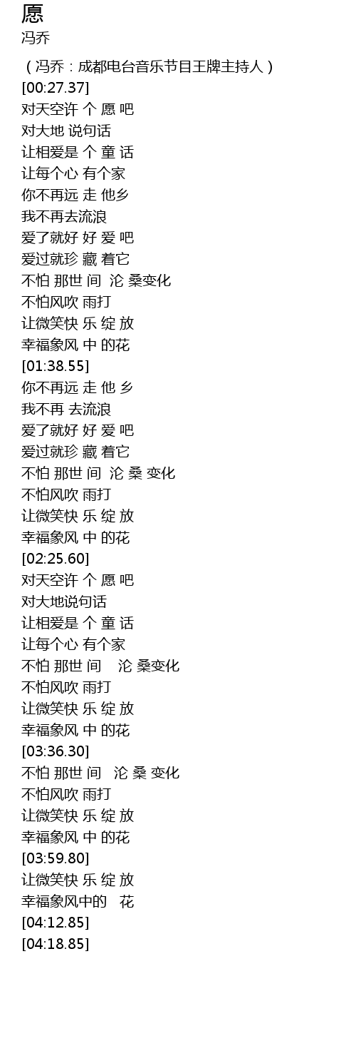| [00:18.87] | féng qiáo: chéng dū diàn tái yīn yuè jié mù wáng pái zhǔ chí rén |