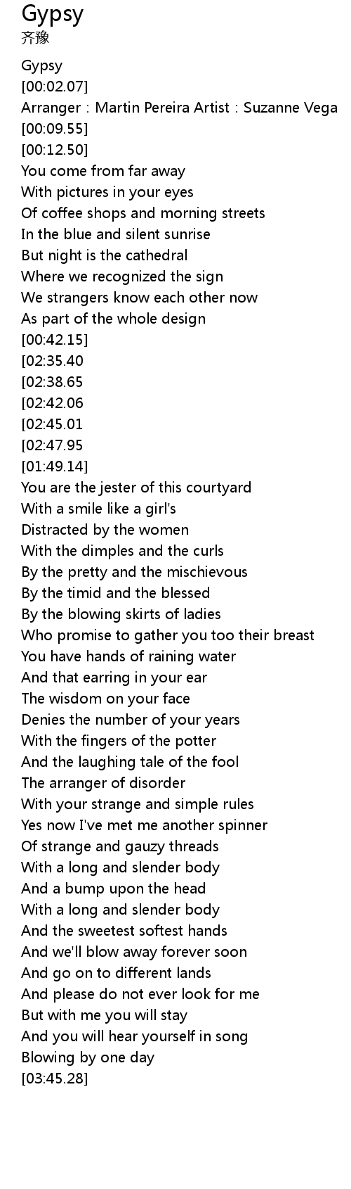 | [00:02.48] | Arranger: Martin Pereira Artist: Suzanne Vega |