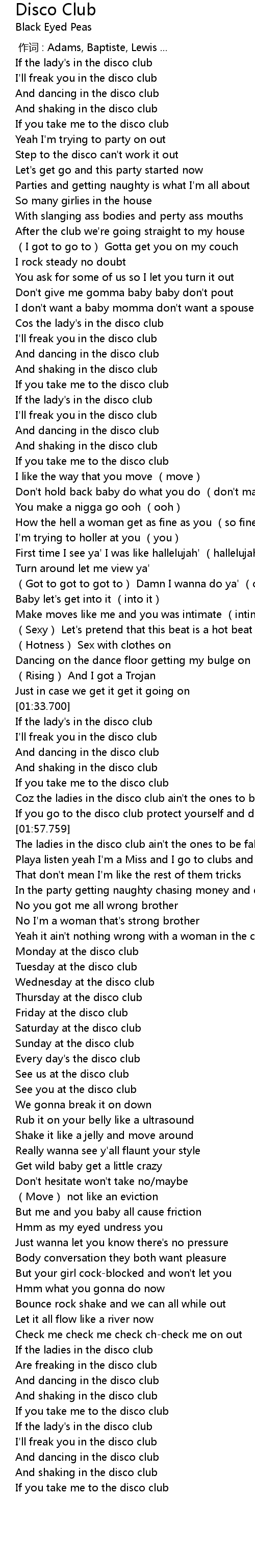 | [01:41.460] | If the lady's in the disco club |
